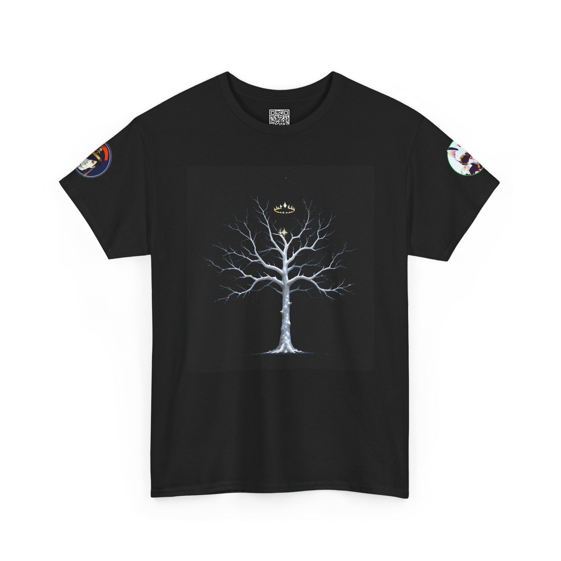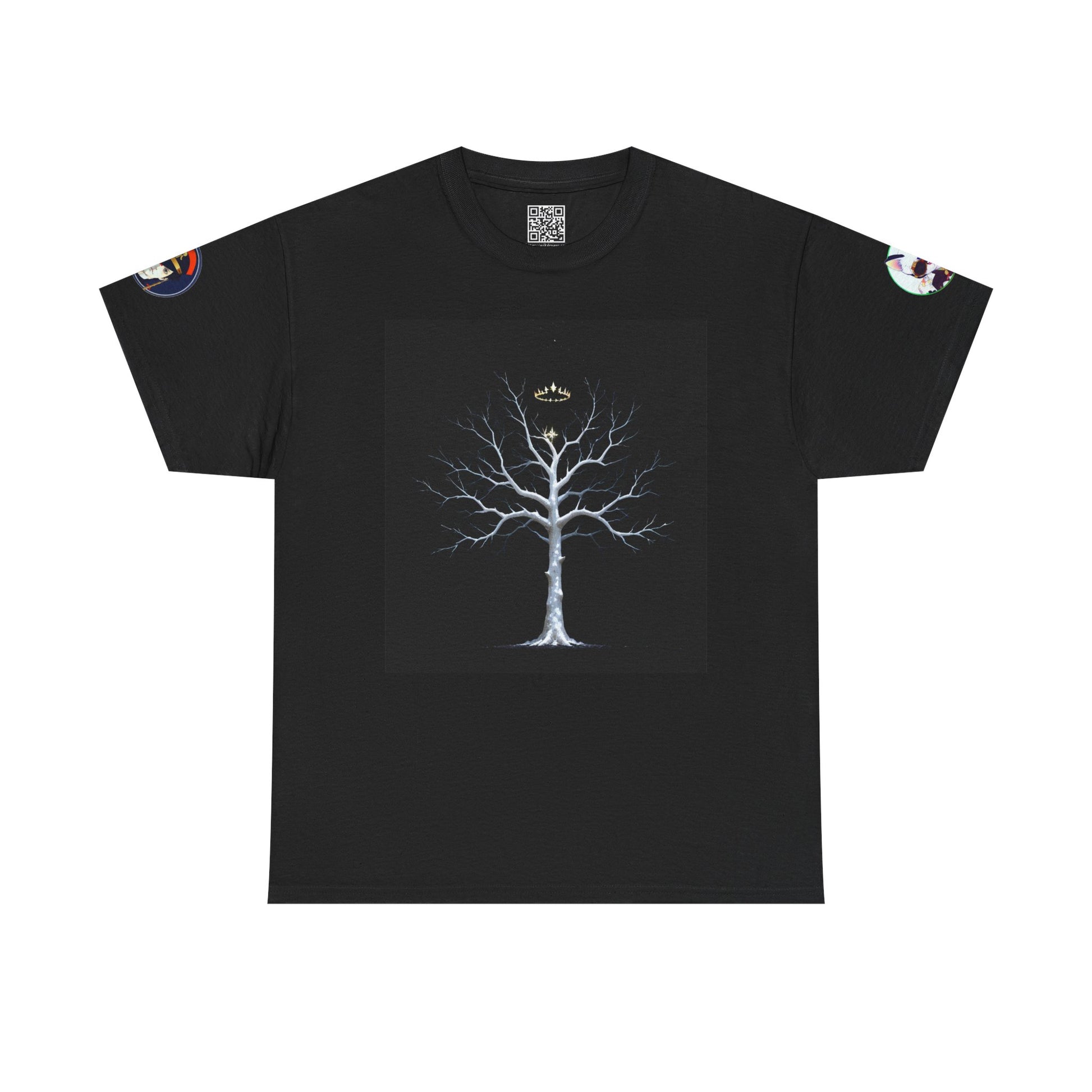 A soft, breathable tee that carries quiet mystery. A stark, luminous tree spreads delicate, bare branches across the chest like frost caught in moonlight. Small sleeve emblems add a subtle, talismanic touch—details that reward a closer look. Wear it on cool evenings while wandering city streets or layered under a jacket for nights around a fire. The relaxed crew fit and medium-weight cotton keep the silhouette comfortable and grounded, while the smooth print holds its clarity wash after wash. This shirt settles into your wardrobe as a thoughtful, low-key statement piece for people who favor atmosphere over flash.